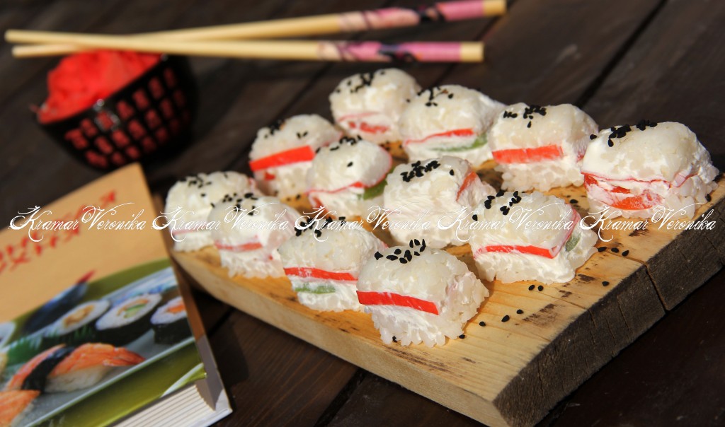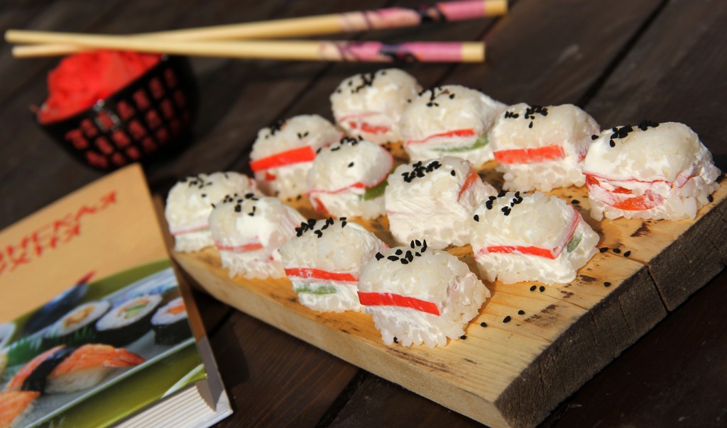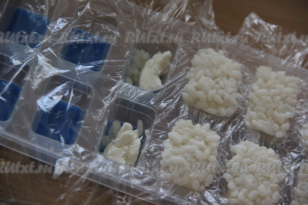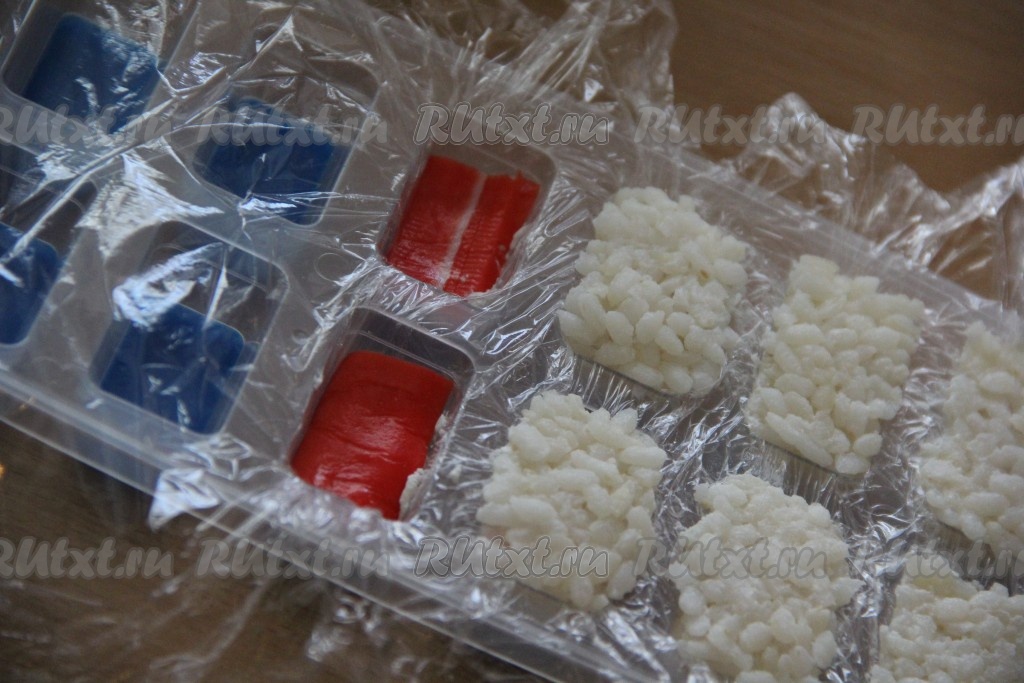 Хорошо промыть рис проточной водой. Выложить промытый рис в кастрюлю и залить водой в соотношении 1 к 2 (то есть воды должно быть в 2 раза больше, чем риса), поставить на огонь. Когда вода закипит, уменьшить огонь, прикрыть кастрюлю крышкой и варить рис, примерно, 15-20 минут на среднем огне (вода должна полностью выпариться). В готовый рис можно добавить рисовый уксус, перемешать, накрыть полотенцем и дать полностью остыть. Рис можно сварить заранее и хорошо остудить. Форму для льда застелить пищевой плёнкой. На дно каждой лунки в форме для льда выложить немного риса. Поверх риса разместить немного творожного сыра.