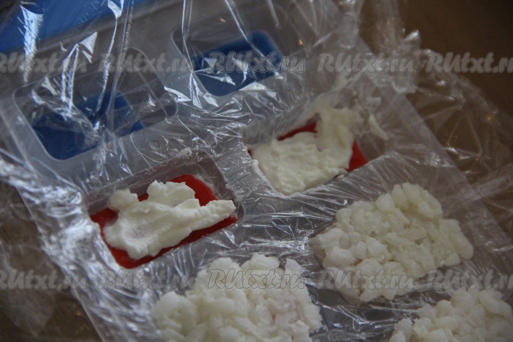 Крабовые палочки развернуть, нарезать на кусочки по размеру лунок для льда. Выложить кусочки крабовых палочек поверх сыра и плотно прижать.