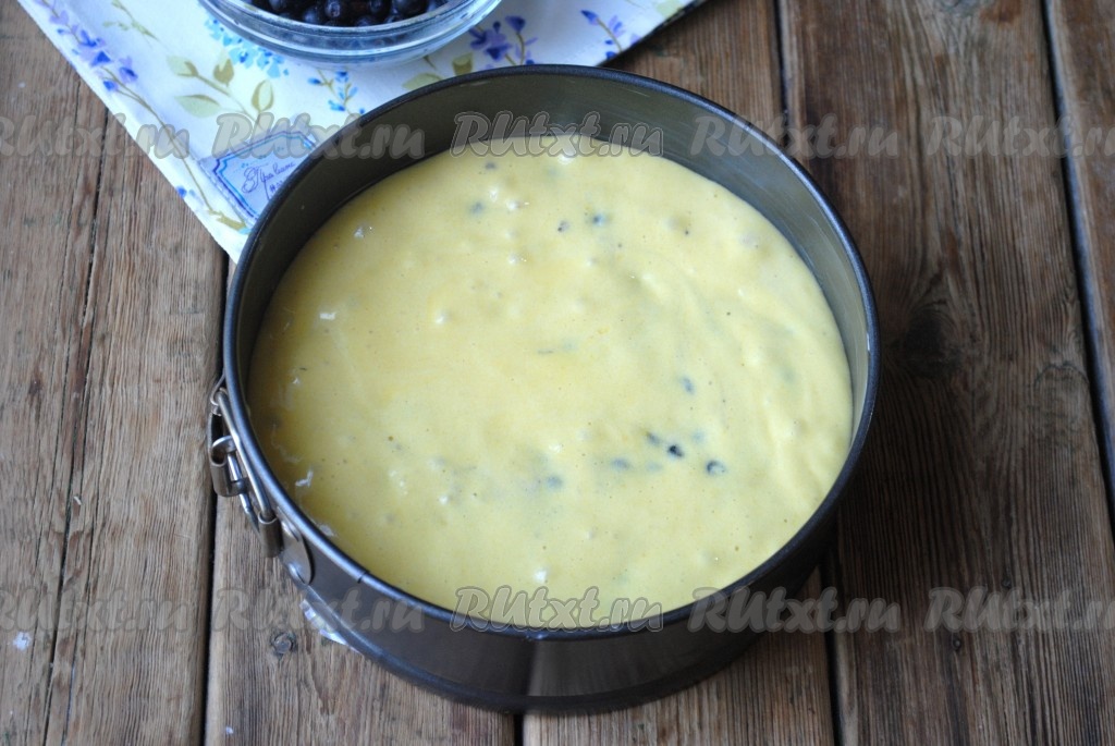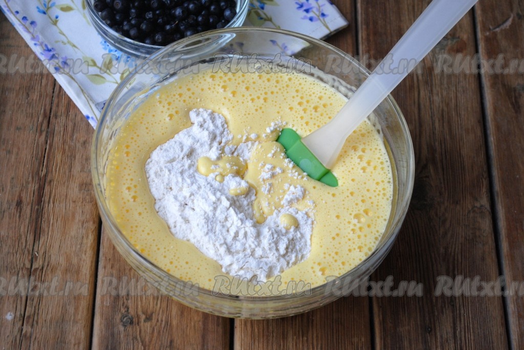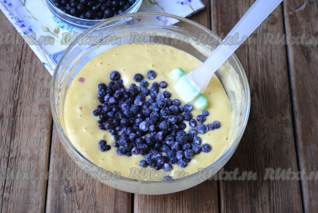 Подготовленную чернику смешать с 1 чайной ложкой муки (это делается для того, чтобы черника в дальнейшем лучше распределилась по тесту), а затем добавить ягоды в тесто, перемешать.