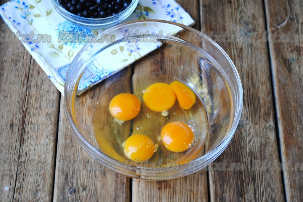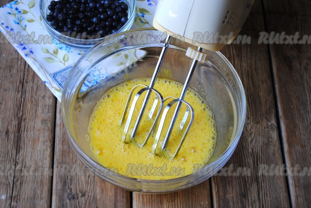 Чернику для приготовления шарлотки можно взять не только свежую, но и замороженную. Свежую чернику нужно перебрать, убирая листочки и сор, промыть ягоды водой, разложить на бумажном полотенце, чтобы они немного обсохли. Если на замороженной чернике нет большого количества льда, значит ягоды можно не размораживать. Приступаем для замешиванию теста для шарлотки, для этого яйца нужно разбить в миску, в которой будет удобно взбивать миксером.