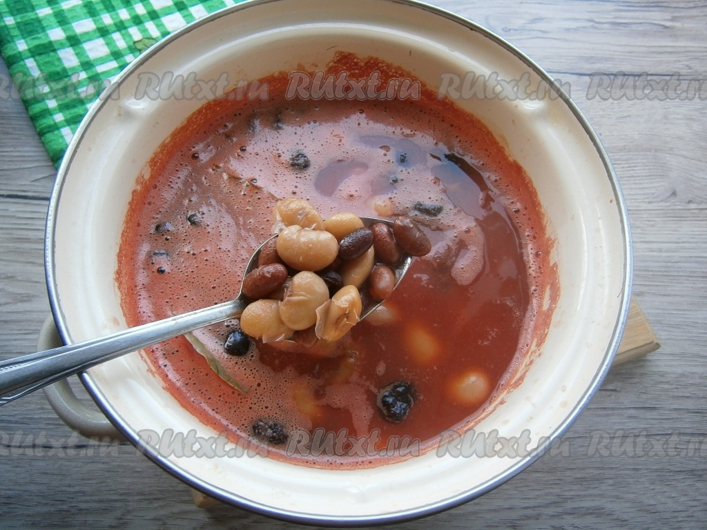 Поставить кастрюлю на огонь, довести томат до кипения, добавить вареную фасоль.