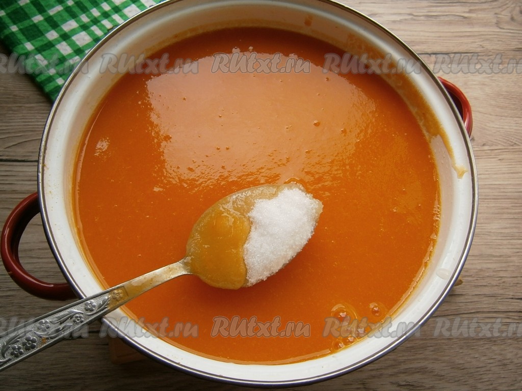 Смешать в кастрюле сок и процеженную жидкость из жмыха, всыпать сахар, перемешать. Сахар кладите по вкусу.