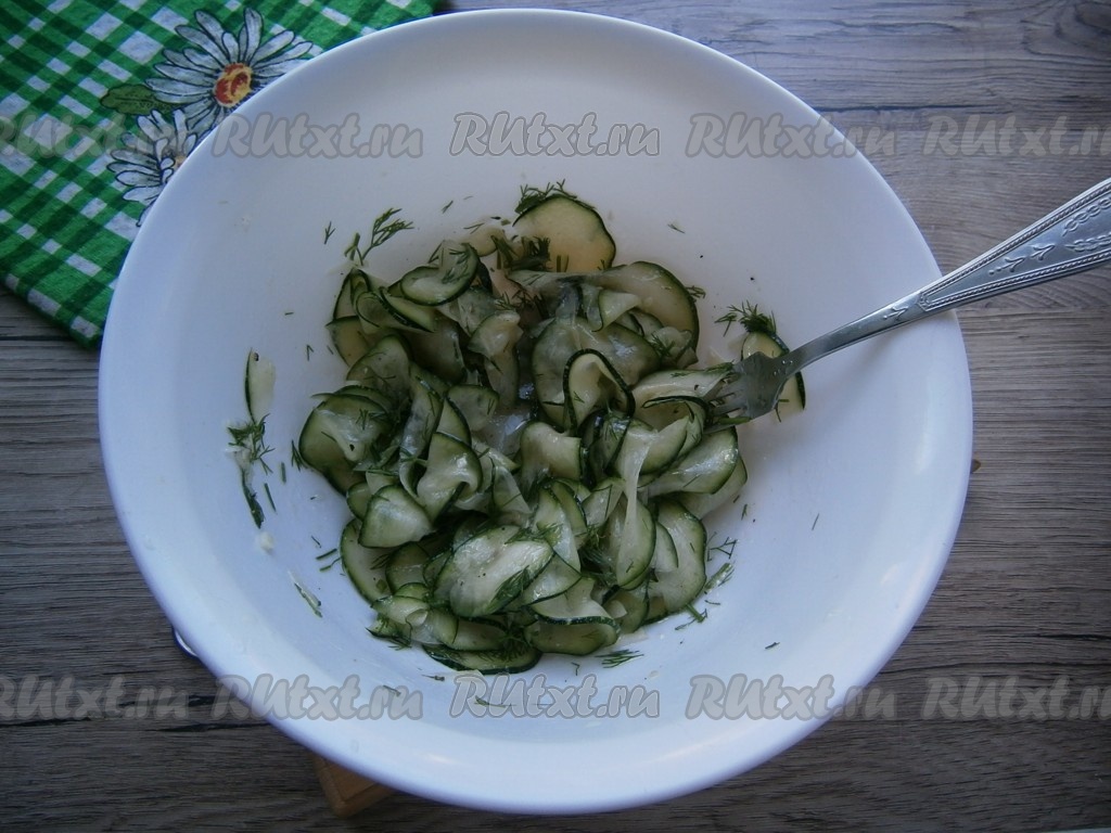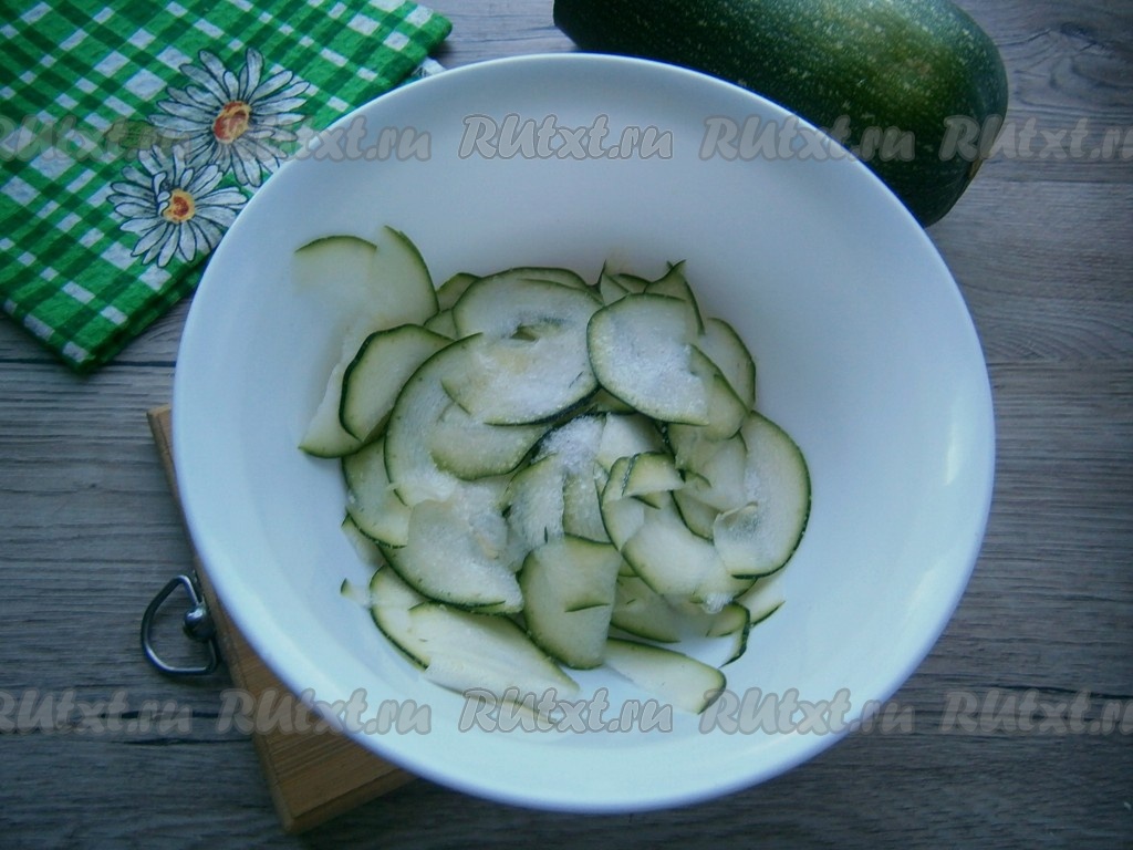 Молодой цукини (можно не очищать) обязательно нужно нарезать очень тонко. В этом поможет терка для шинковки капусты, терка Бернера или обычная овощечистка. Если нарезать цукини овощечисткой, получатся тоненькие слайсы. К тонко нарезанному цукини добавить соль, перемешать и оставить на 30 минут.