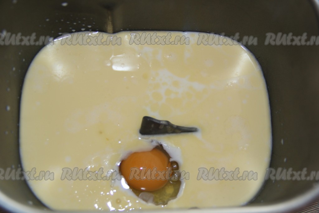 Выставить режим "Замес теста" (в моей хлебопечке замешивание теста длится 1,5 часа). Если замешивать тесто вручную, тогда нужно растворить дрожжи в тёплой воде, затем соединить смесь дрожжей и воды с тёплым молоком, яйцом и растопленным не горячим сливочным маслом, перемешать, всыпать соль, сахар, частями подсыпая муку, замесить мягкое, не липнущее к ладоням тесто. Оставить тесто в миске под полотенцем на 1,5 часа. Тесто хорошо поднимется, увеличившись в 2-3 раза.
