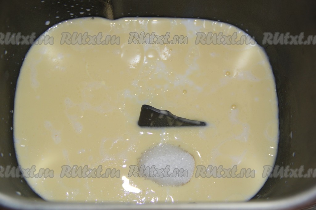 Если замешиваете тесто в хлебопечке, тогда в ведёрко хлебопечки нужно влить тёплое молоко и тёплую воду (их температура не должна быть выше 40 градусов), растопленное не горячее сливочное масло, всыпать сахар.