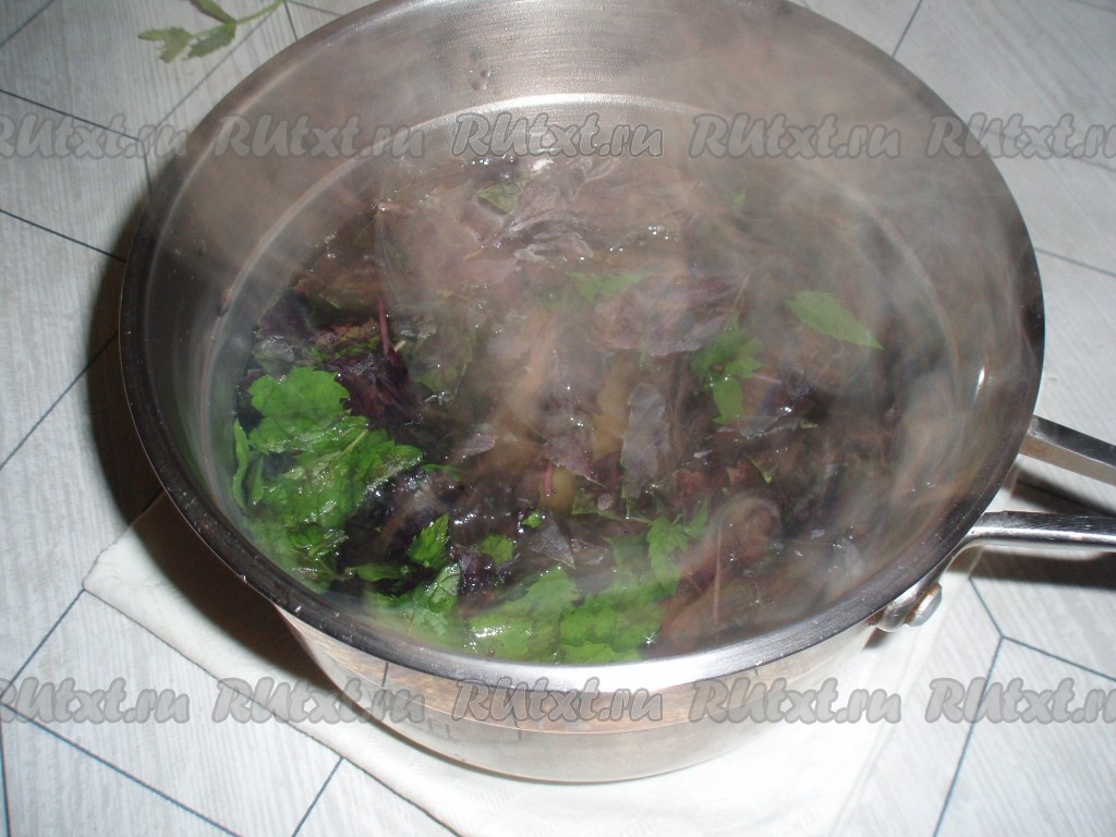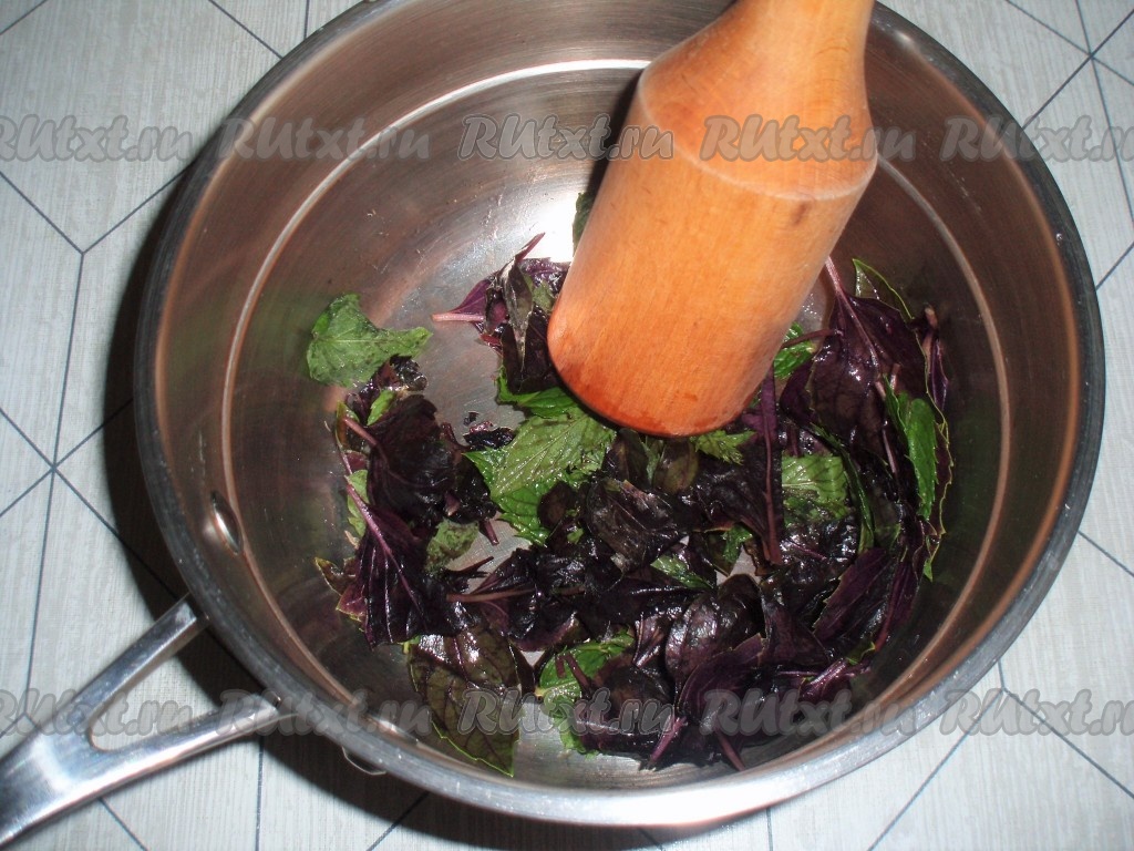 Оборвать листочки базилика и мяты, растереть их для усиления аромата в посуде, в которой будем готовить напиток.