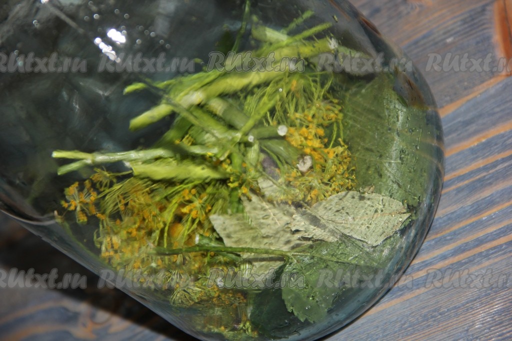 В простерилизованную банку выложить листья смородины, дуба, вишни, хрена, зонтики укропа, перец горошком и лавровые листья. Чеснок очистить и добавить в банку.