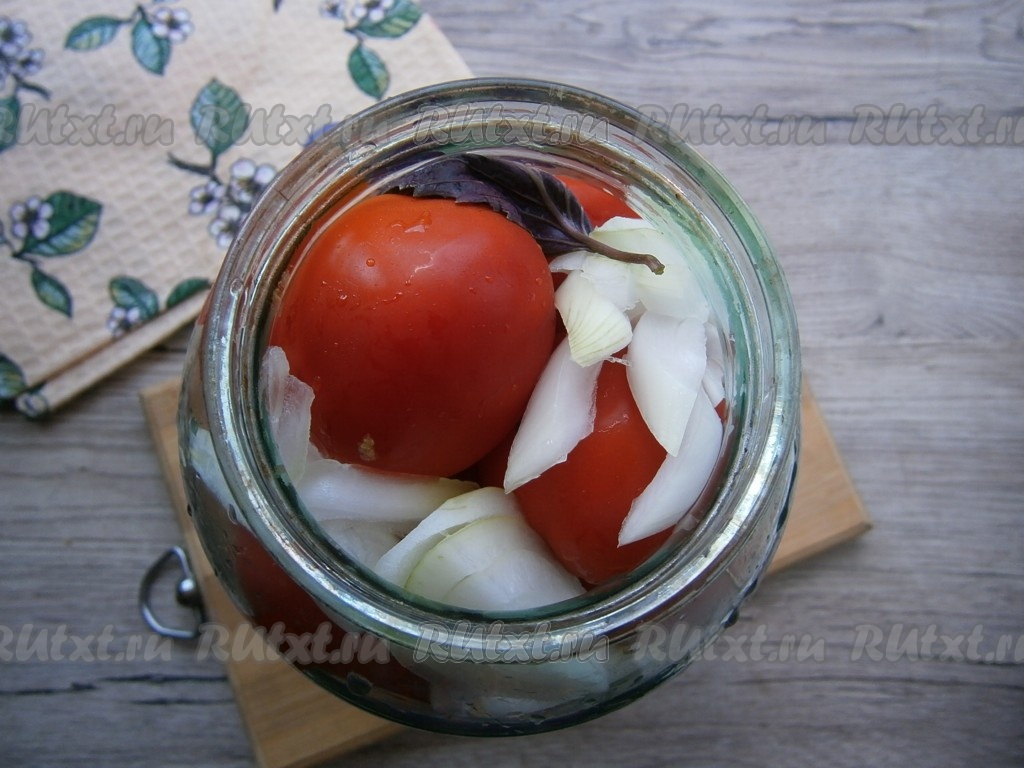 Далее доверху наполнить банку помидорами и разместить оставшийся лук и пару листиков базилика.