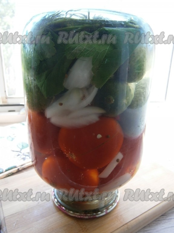 Предлагаю вам приготовить вкусное ассорти из огурцов, помидоров и лука на зиму. Эта заготовка хороша тем, что в одной баночке находятся разные овощи - кому огурчики, кому - помидорчики, а кому - и лучок! Очень вкусно, попробуйте! Из данного количества продуктов получится одна двухлитровая баночка овощного ассорти.