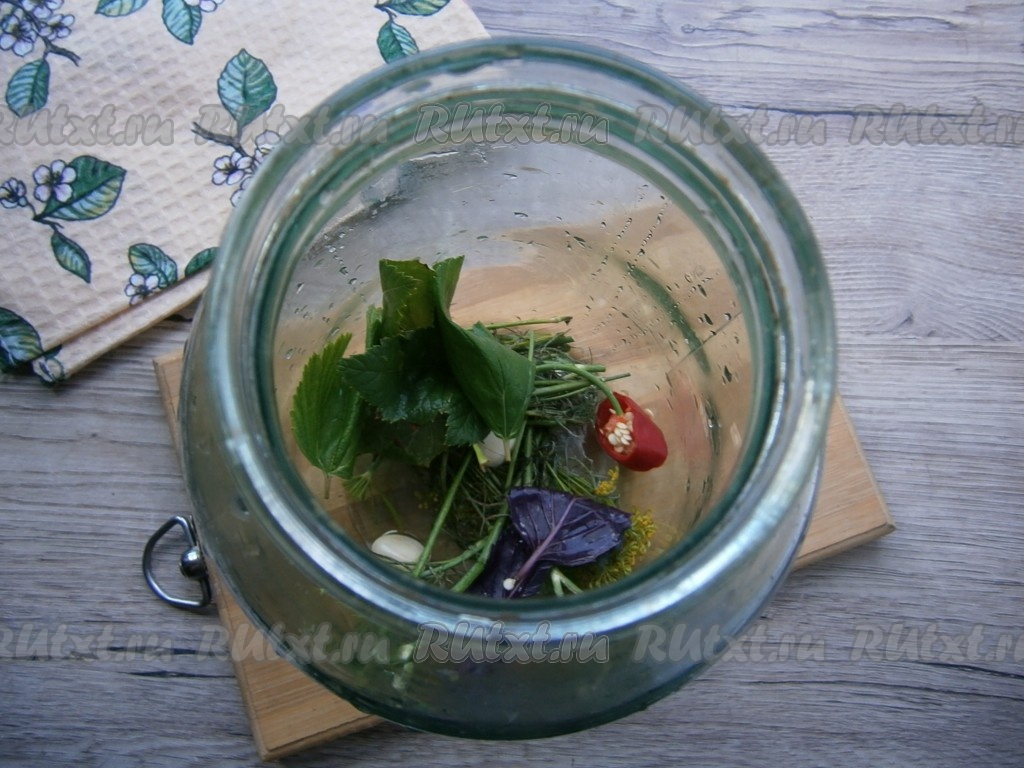 На дно чистой банки выложить укроп, очищенный чеснок, горький перец, листья смородины и листочек базилика.