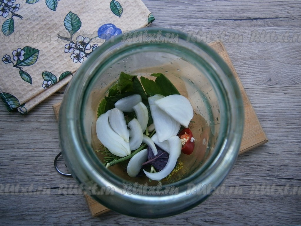 Лук очистить и нарезать полукольцами или перьями. Треть лука выложить в банку.