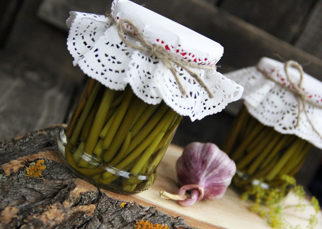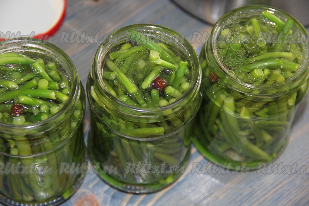 Залить горячим маринадом банки с чесночными стрелками.