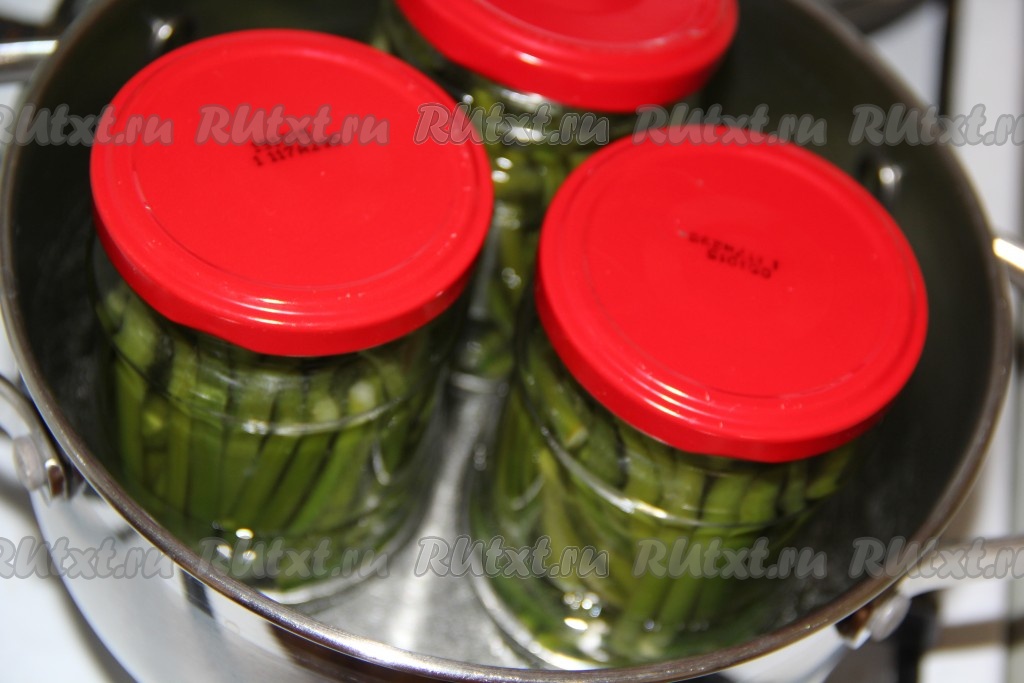 Прикрыть банки прокипяченными крышками, поместить в кастрюлю с тёплой водой (на дно кастрюли, чтобы банки не лопнули в процессе стерилизации, можно положить старое полотенце или тряпочку, сложенную в 2-3 раза, - я этого не делаю), поставить на средний огонь и довести до кипения, стерилизовать банки с чесночными стрелками в течение 5 минут с момента закипания.
