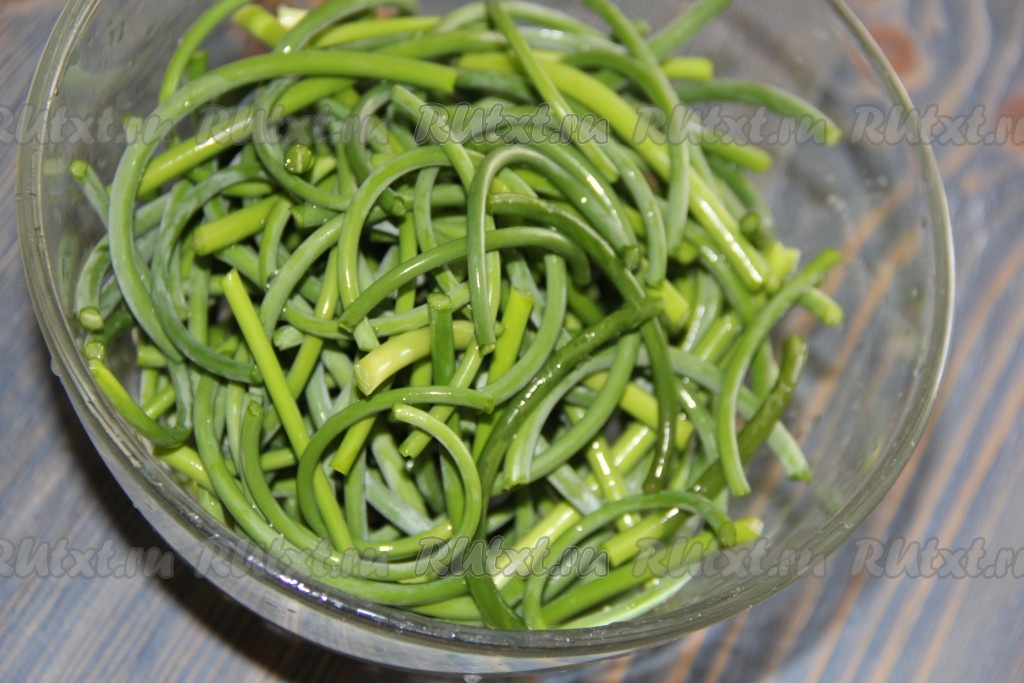 Чесночные стрелки промыть под проточной водой, соцветия отрезать (они нам не понадобятся). Стрелки нарезать на полоски, длина которых равна высоте ваших банок.