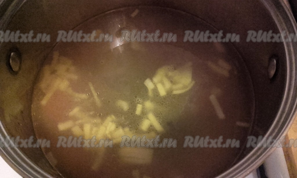 К обжаренным овощам добавить процеженный рыбный бульон. Довести до кипения.