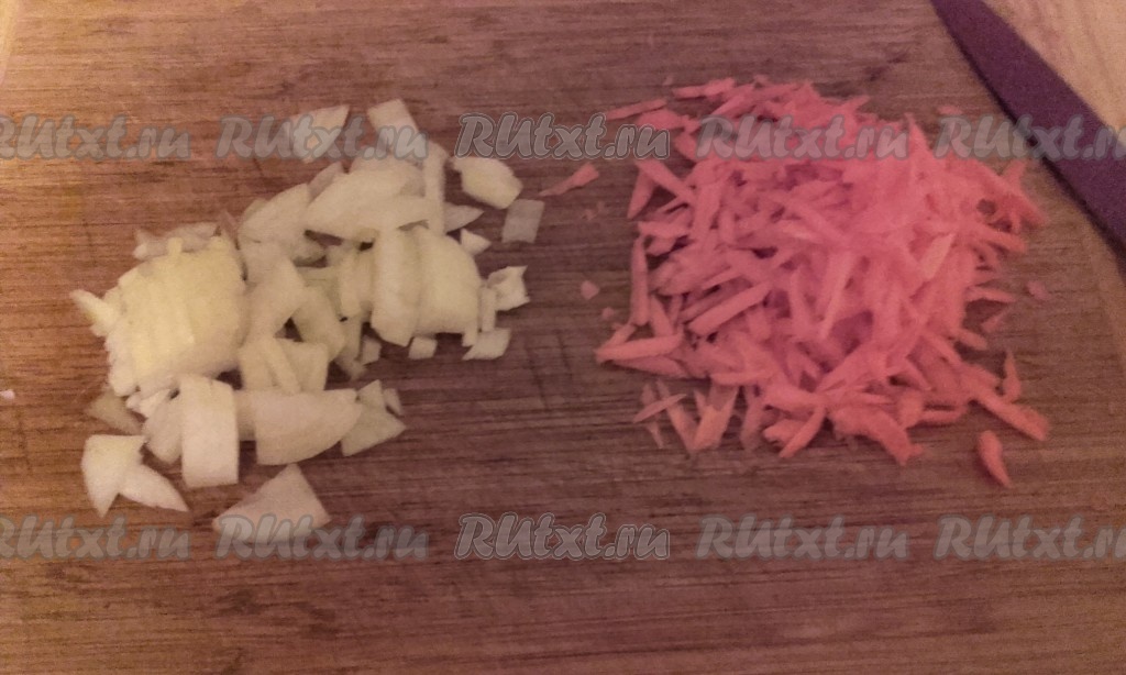 Морковь вымыть, очистить, натереть на крупной терке. Оставшуюся луковицу очистить, мелко нарезать.