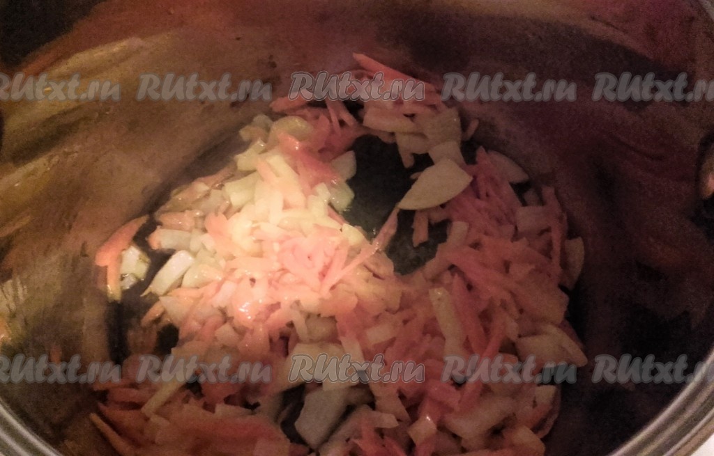 В кастрюле с толстым дном обжарить, помешивая, лук и морковь с добавлением растительного масла на среднем огне. Положить щепотку куркумы, перемешать.
