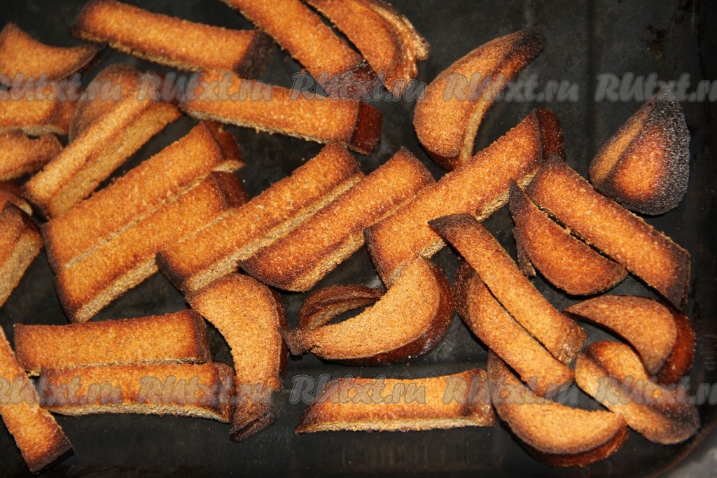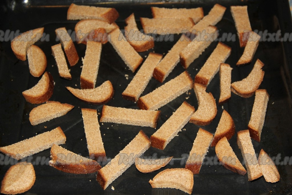Ржаной хлеб (лучше, если он будет не свежим) нарезать на кусочки, выложить на противень.