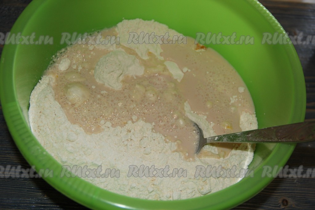 Слегка перемешать и добавить в муку подошедшие дрожжи с молоком.