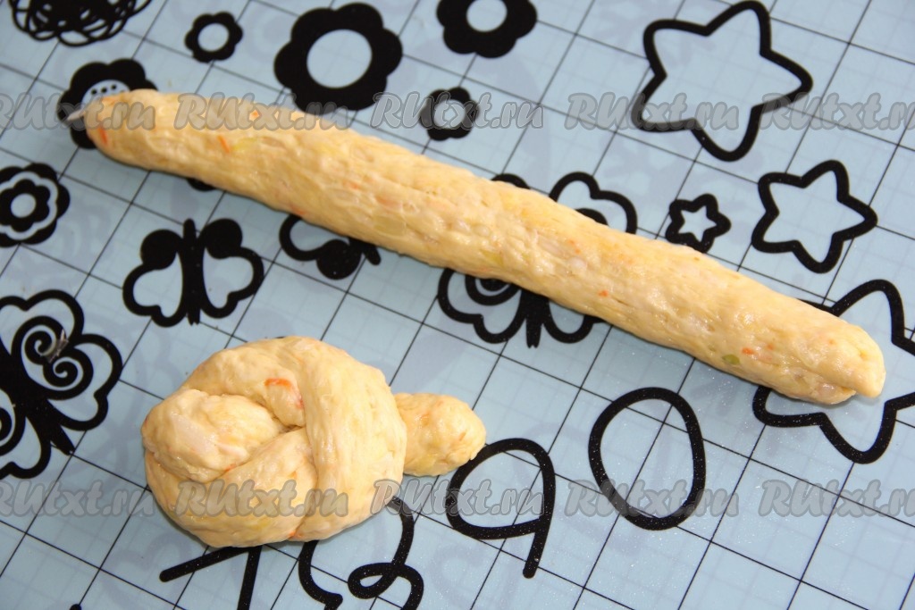 Руки смазать растительным маслом и сформировать булочки любой формы - можно просто кругленькие, я завязала узелки (как на фото). У нас получится 12 капустных булочек.