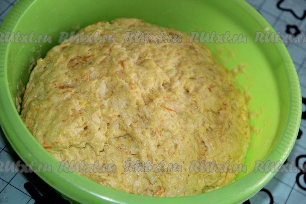Слегка перемешать ложкой, а затем добавить капусту.