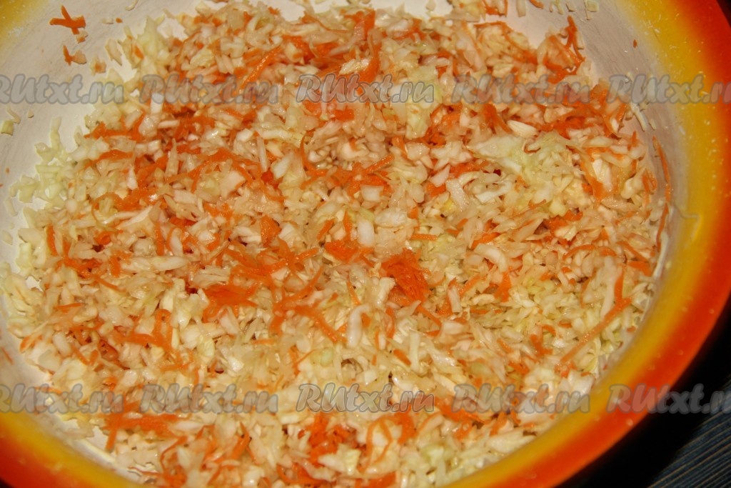 Посолить капусту с морковкой, хорошо помять руками, равномерно распределяя соль и перемешивая.