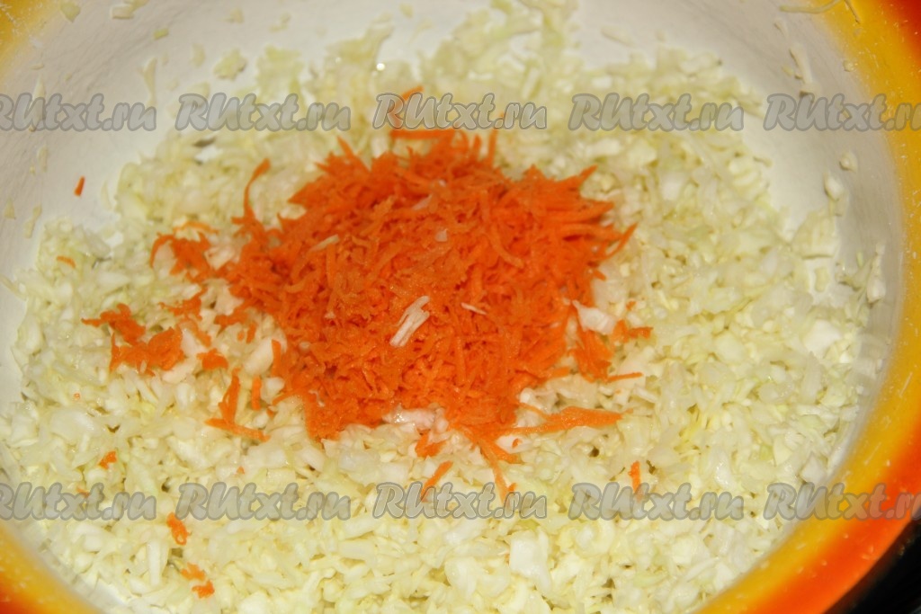 Очищенную морковь, натерев на мелкой тёрке, добавить к капусте.