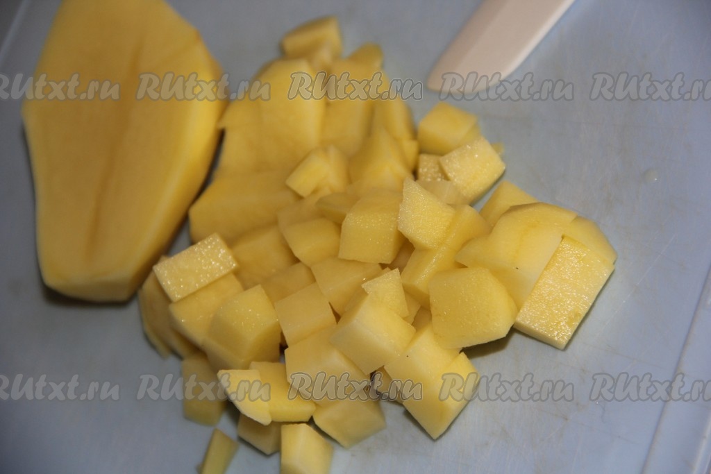 В кипящий бульон вернуть мясо, добавить картофель и капусту. Варить овощи, примерно, 15 минут на небольшом огне.