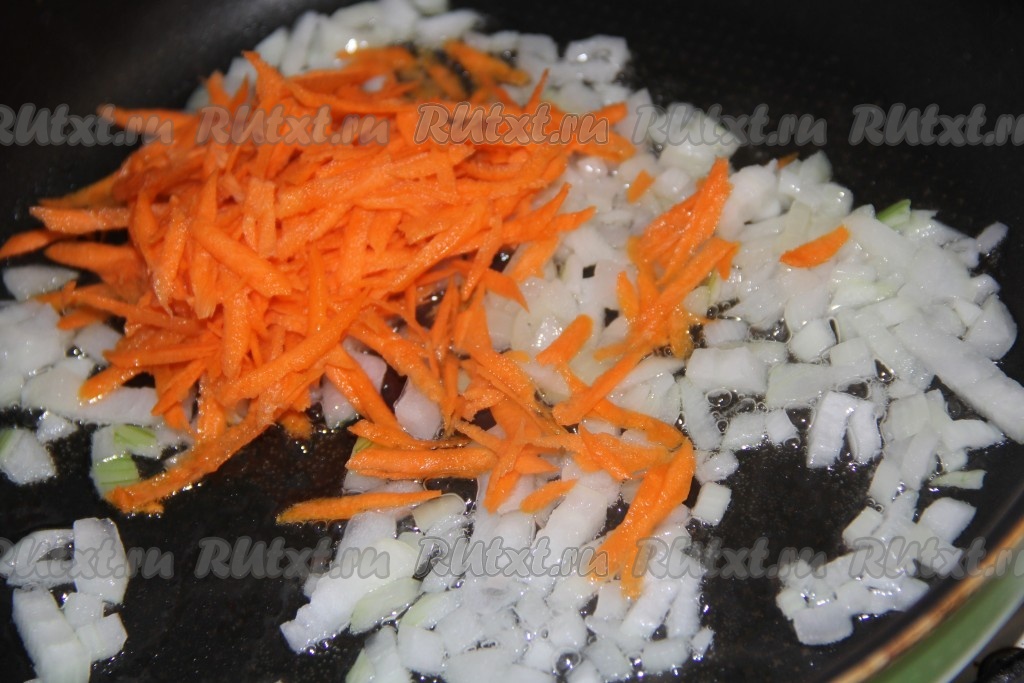 Добавить морковь к луку и обжарить на среднем огне в течение 5 минут, не забывая иногда перемешивать.