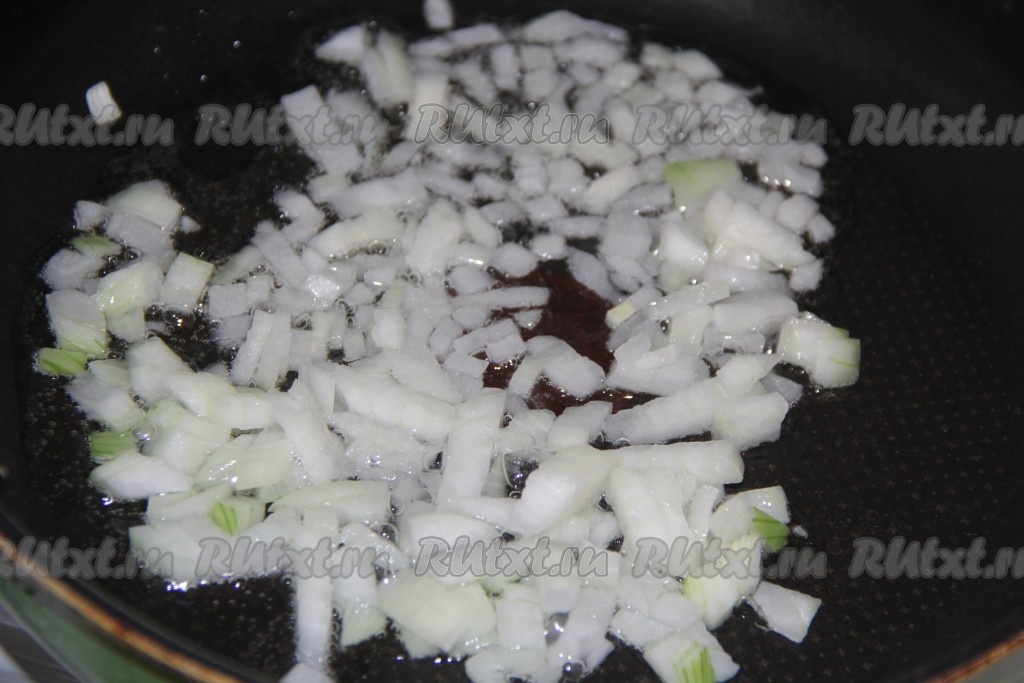 Лук очистить и мелко нарезать. Выложить лук в сковороду, добавить растительное масло. Обжарить лук, помешивая, до прозрачности.