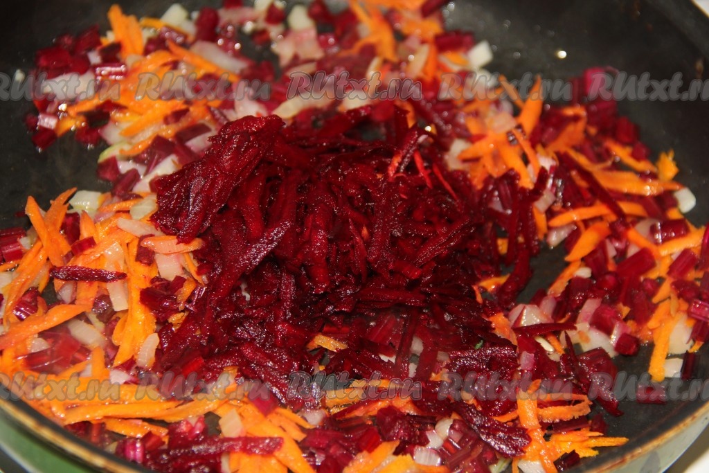 Свеклу хорошо вымыть. Если свекла молодая, то её можно готовить, не очищая от кожуры. Натереть свеклу на крупной тёрке. Добавить ботву и свеклу в сковороду с морковкой и луком. Влить пару столовых ложек бульона из супа в сковороду и тушить овощи, примерно, 10 минут на небольшом огне, иногда перемешивая.