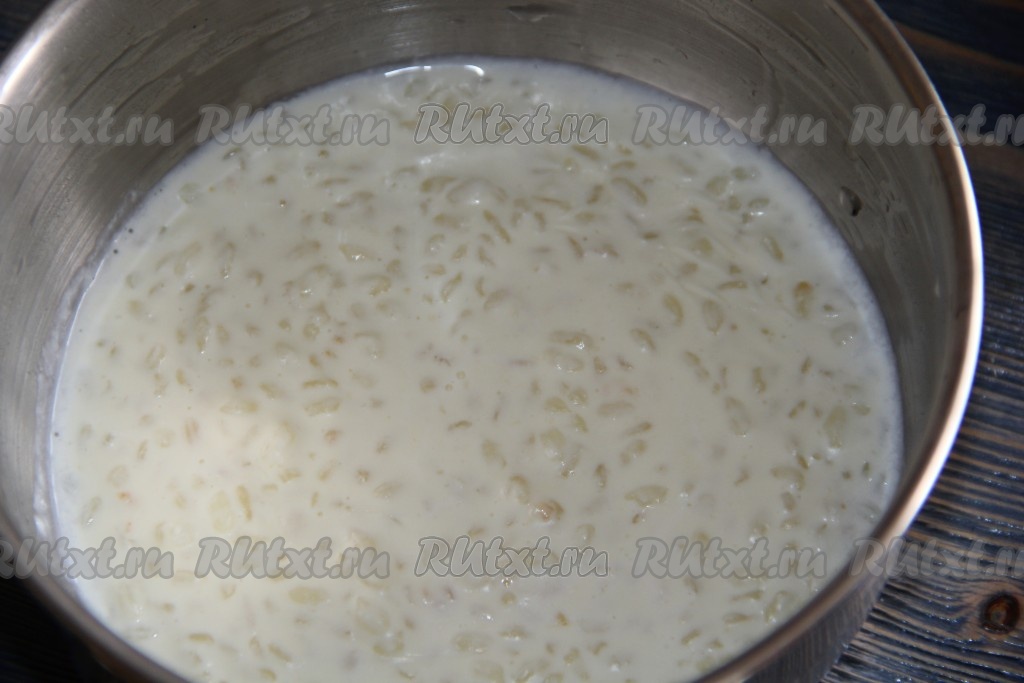 Каша загустеет, снять кастрюлю с огня и слегка остудить. Молочная рисовая каша получается очень вкусной, она станет прекрасной основой десерта.