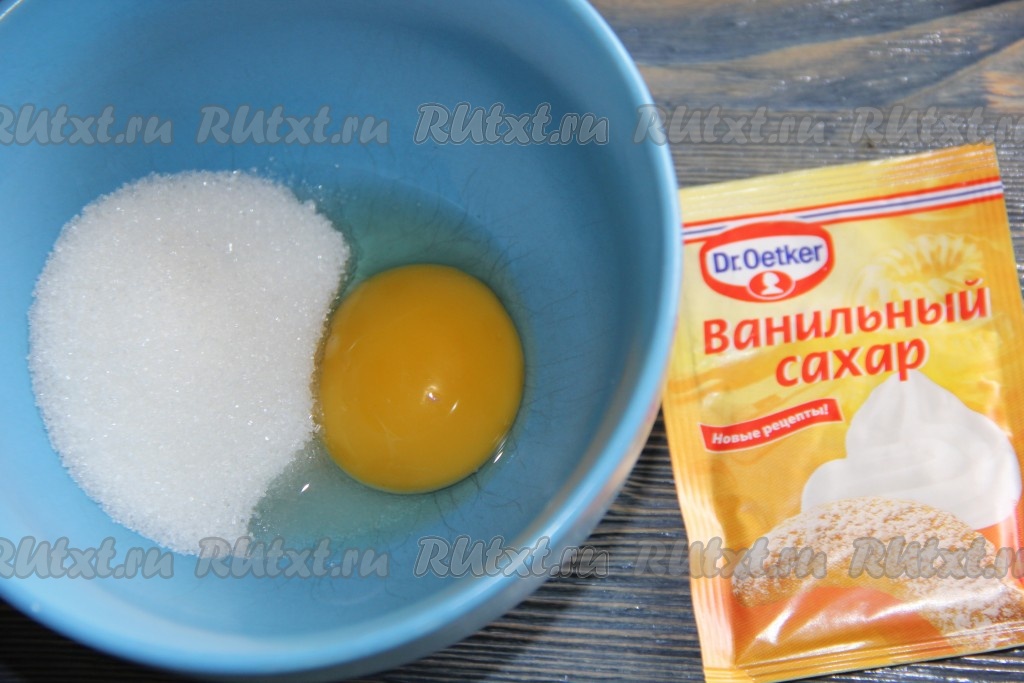В отдельной пиалке соединить яичный желток, сахар и ванильный сахар.