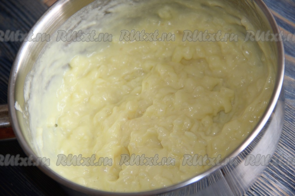 Когда рис сварится, не увеличивая огонь, постепенно влить желтковую массу в кипящую кашу, непрерывно перемешивая.