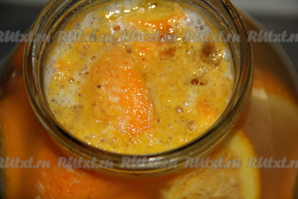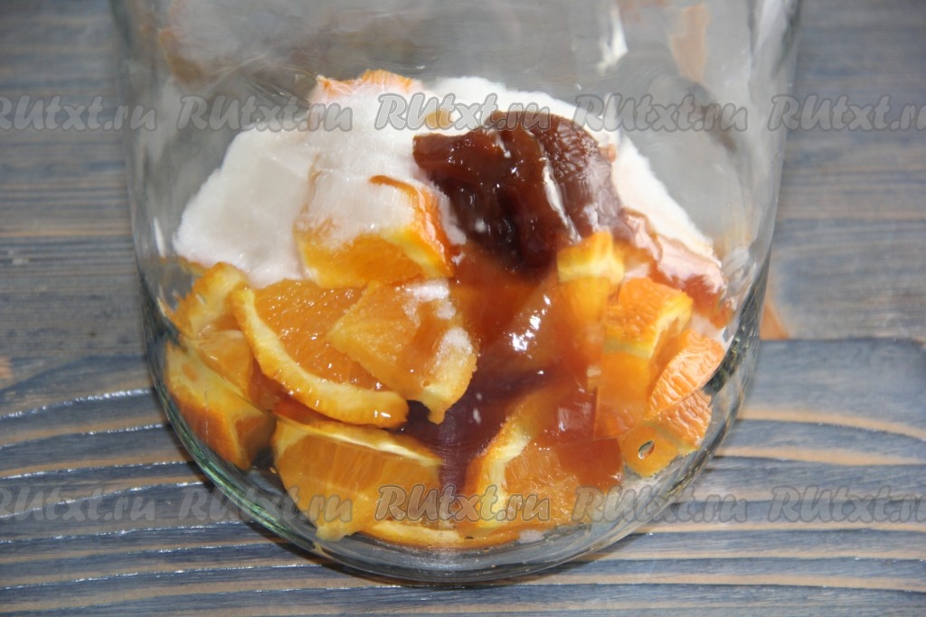 В трёхлитровую банку выложить нарезанный апельсин, добавить мёд, сахар и изюм, всыпать дрожжи и лимонную кислоту.
