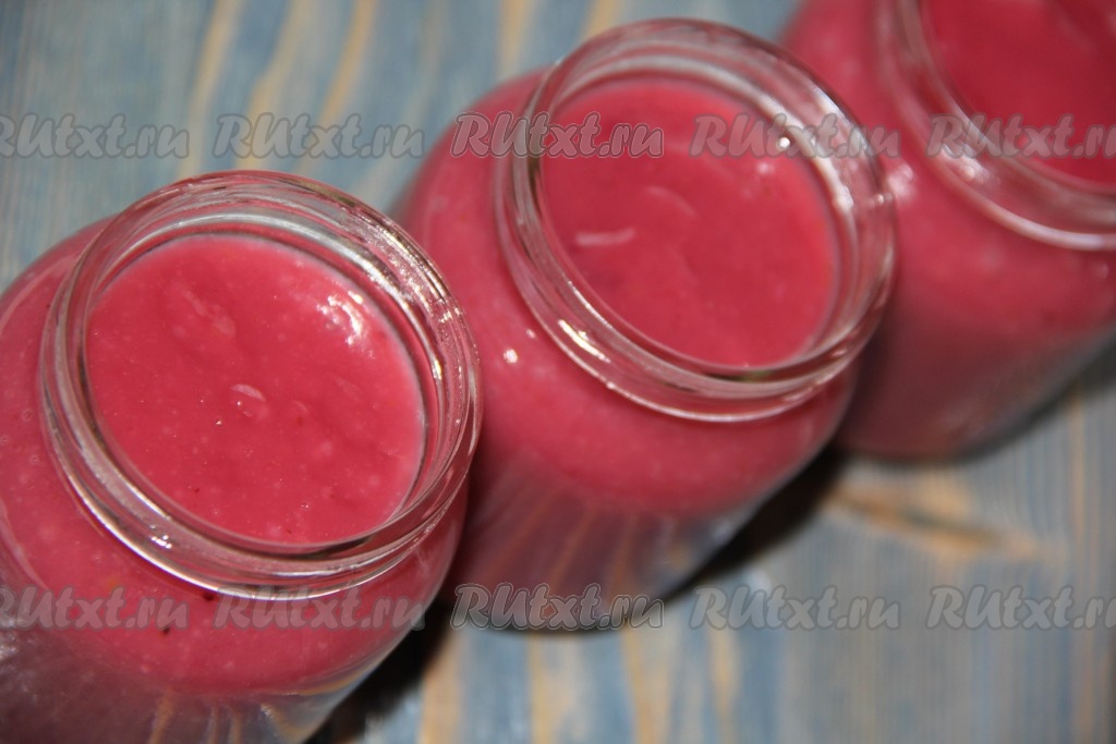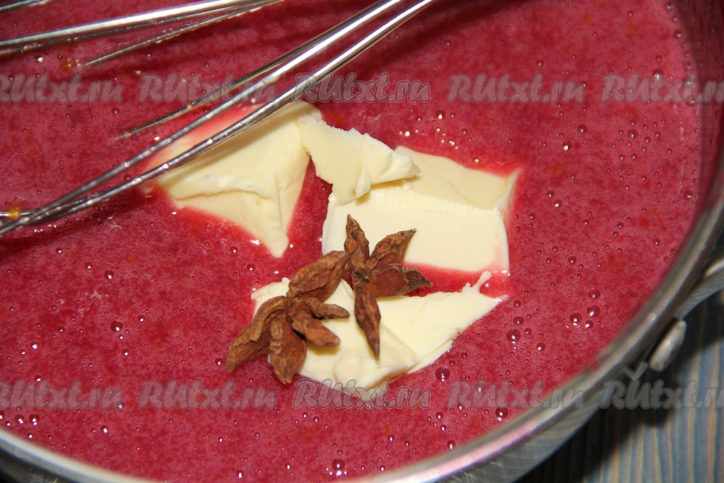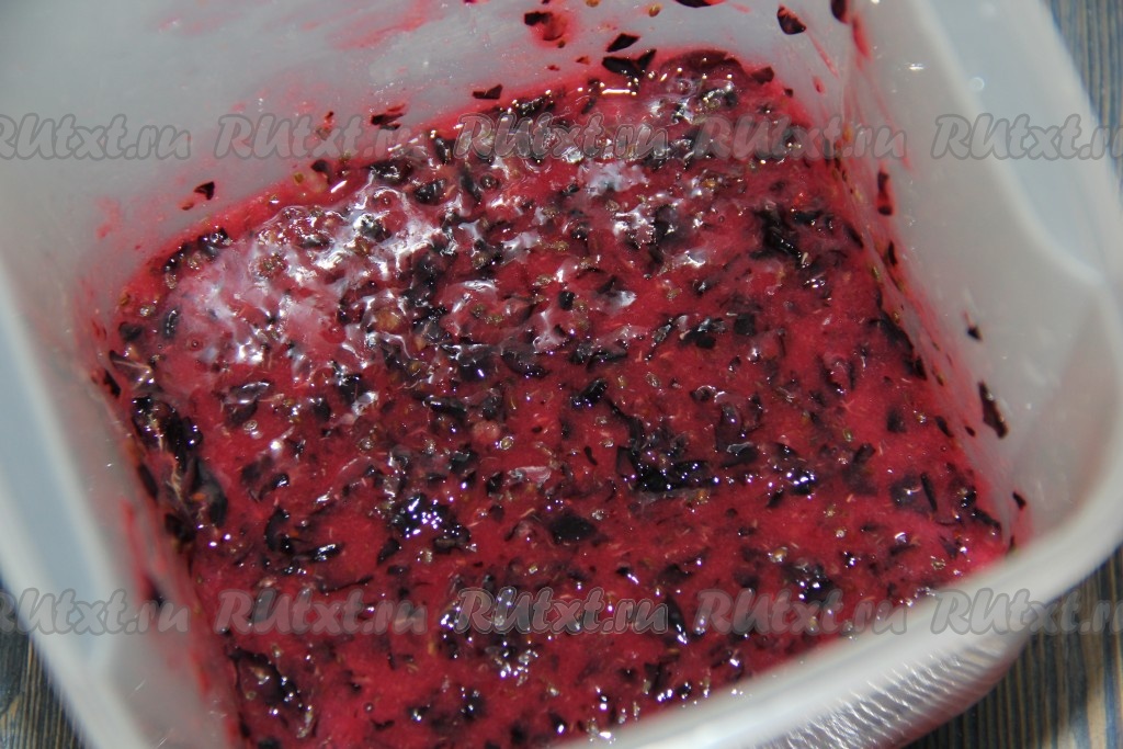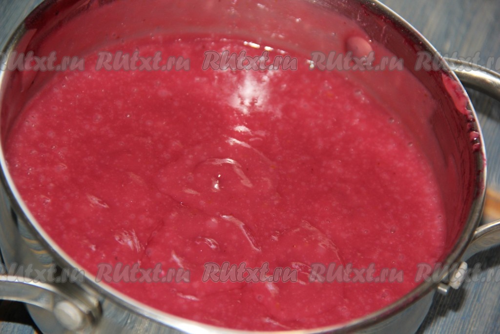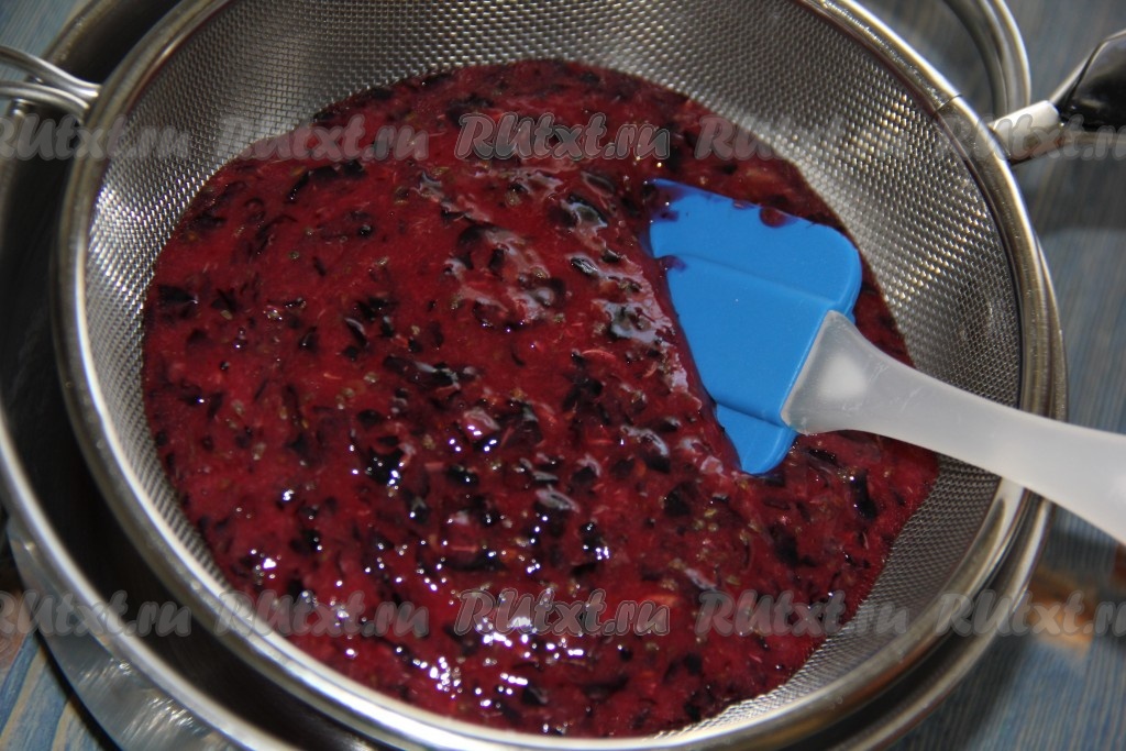 Перетереть пюре через сито в кастрюлю. Жмых с семечками смородины, оставшийся в сите, выкинуть.