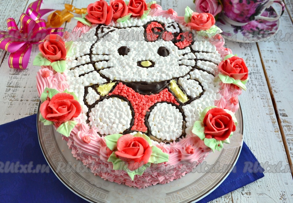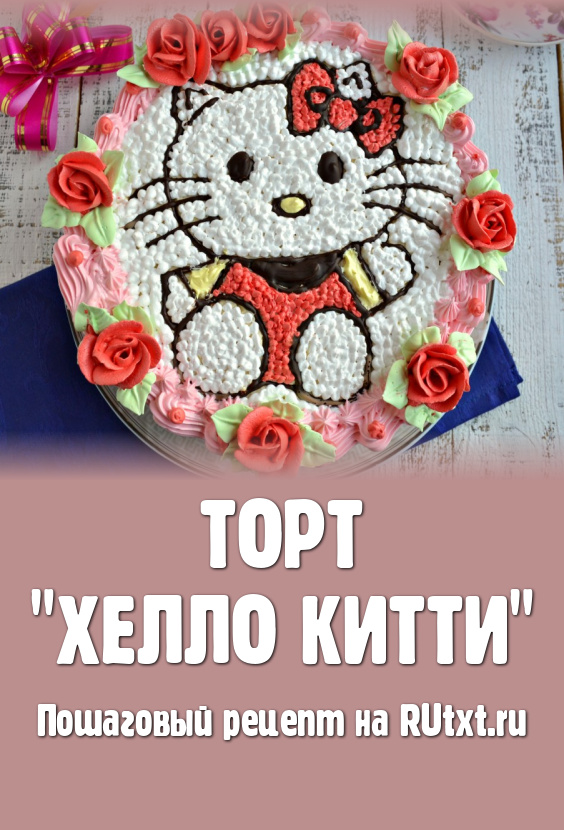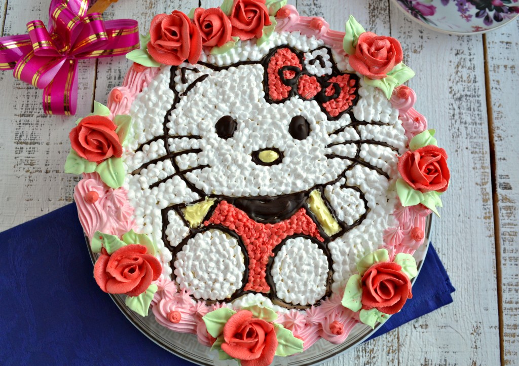 Если вы хотите испечь что-нибудь к торжеству для девочки, предлагаю попробовать торт "Хелло Китти". Этот простой тортик состоит из бисквитов, масляного крема, прослоен джемом и украшен заварным белковым кремом. Я попробовала точечную технику украшения, оказалось, что это несложно, но время, усидчивость и внимательность обязательно понадобятся, чтобы картинка получилась аккуратной. С помощью этой техники можно украшать торты любыми мультяшными героями, картинами и т.д. Торт "Хелло Китти" получается очень нежным и вкусным, попробуйте! Из данного количества продуктов получается тортик весом около 1,5 килограмм. Белковый заварной крем можно приготовить по этому рецепту - его как раз хватит украсить данный торт.