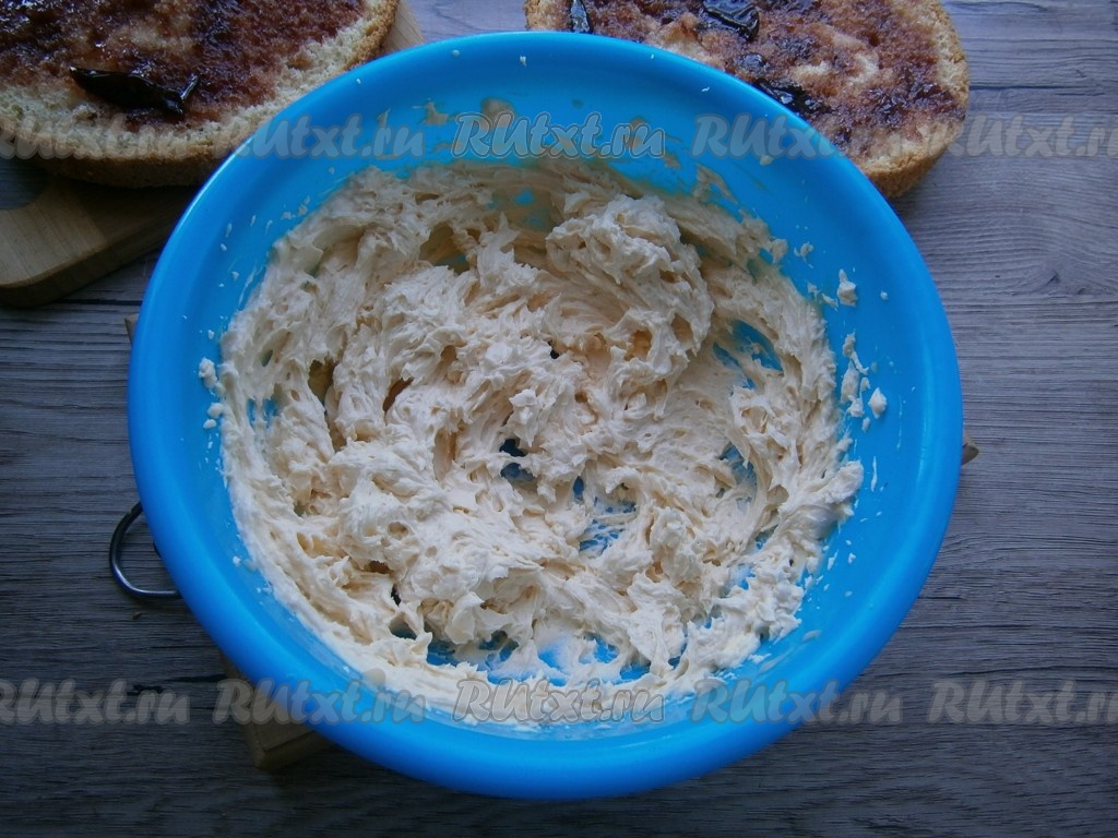 Приготовить крем: размягченное сливочное масло взбить миксером в течение 1 минуты. Продолжая взбивать, добавлять постепенно сгущенное молоко. Крем должен получиться густым и пышным.