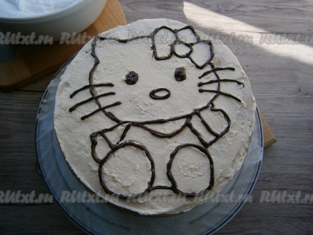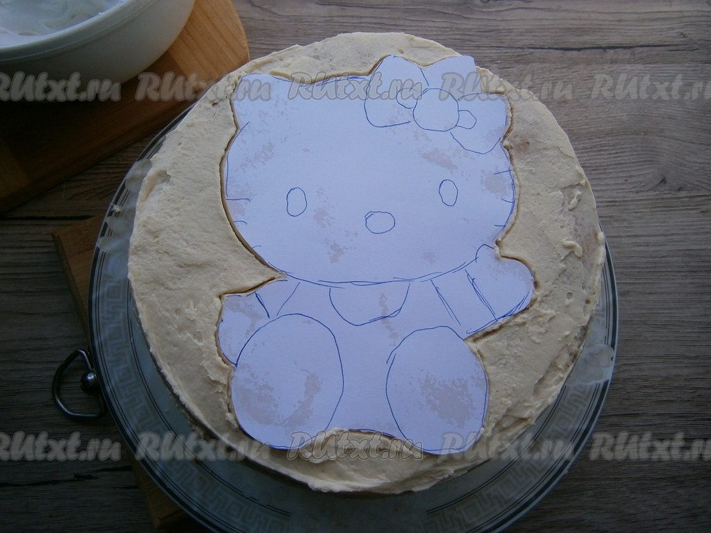 Теперь распечатайте на принтере на белой бумаге картинку Китти или нарисуйте на листе белой бумаги, чтобы она вмещалась на торте. Картинку вырезать и поместить на верх торта. Обвести контуры зубочисткой.