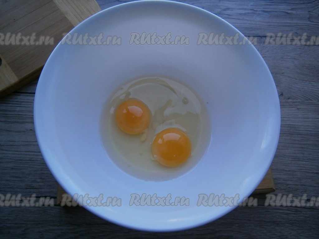 Нам нужно испечь 2 бисквита в разъемных формах диаметром 17-18 см. Для приготовления одного бисквита разбить 2 яйца в миску, добавить щепотку соли.