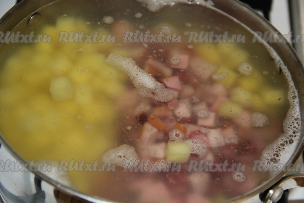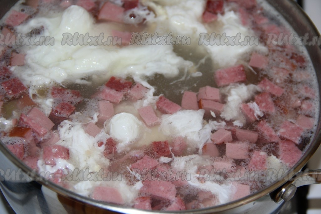 Затем добавить колбасу и варить ещё 10 минут.