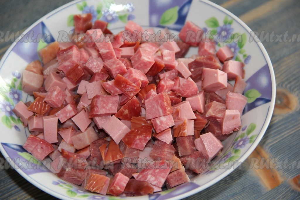 Колбасу нарезать на средние кубики.