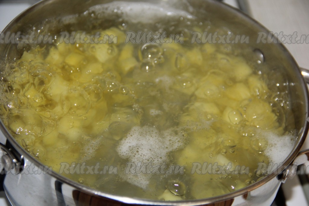 Воду влить в кастрюлю и довести до кипения. Добавить картофель в кипящую воду и варить 10 минут с момента закипания на небольшом огне.