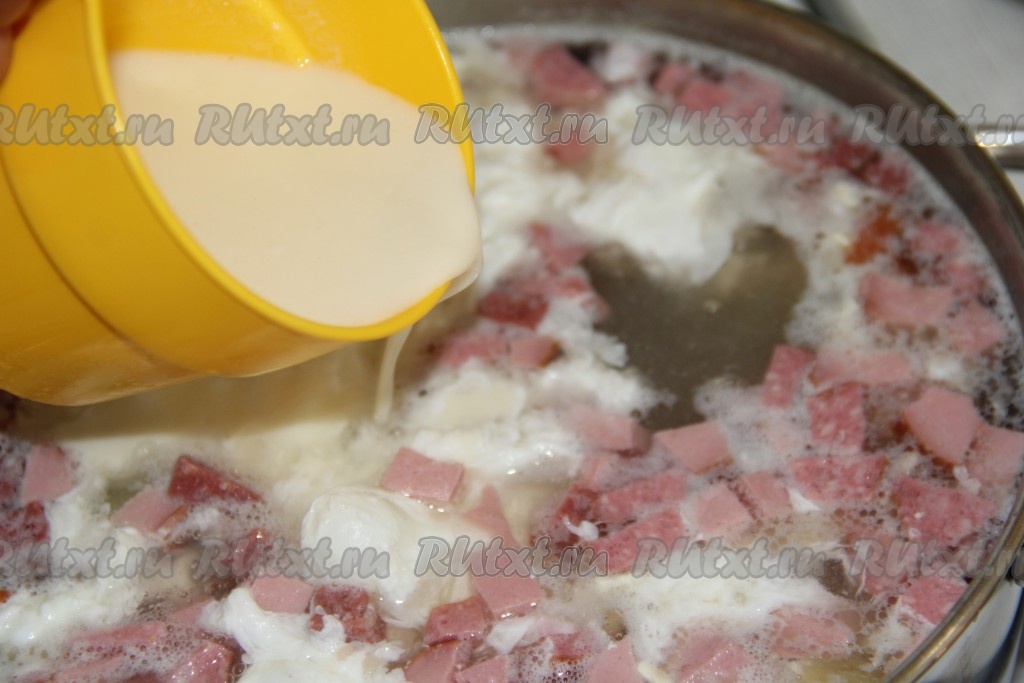 Тонкой струйкой влить мучную массу в суп с колбасой и яйцами, аккуратно и непрерывно перемешивая.