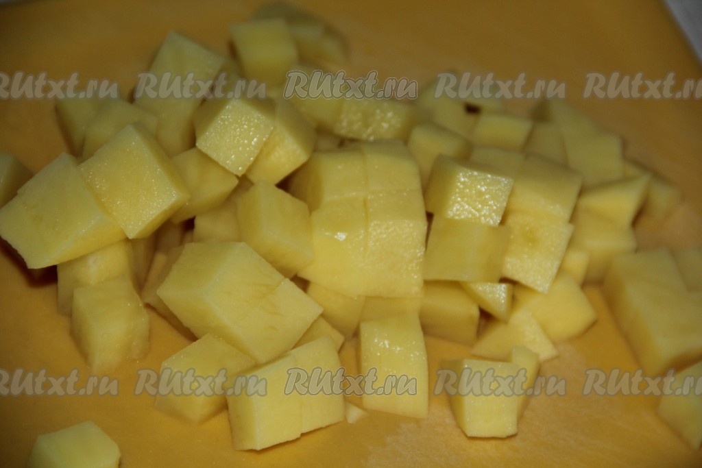 Картофель очистить и нарезать на кубики, примерно, равного размера.