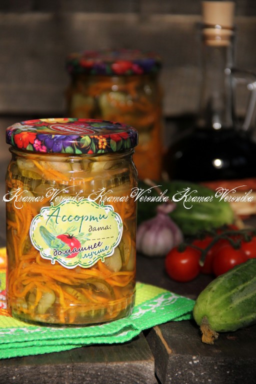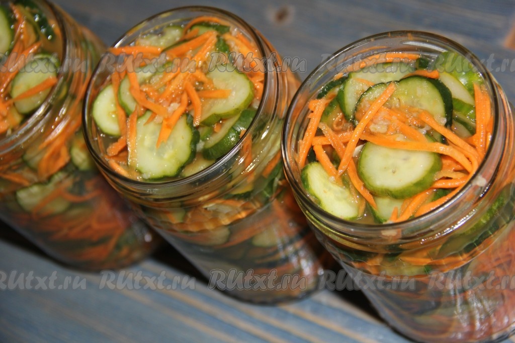 Разложить салат из огурцов и моркови по стерильным банкам и залить выделившимся соком.