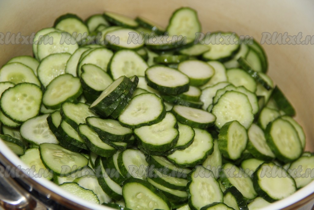 Огурчики вымыть и нарезать тонкими кружочками. Поместить огурцы в глубокую кастрюлю.