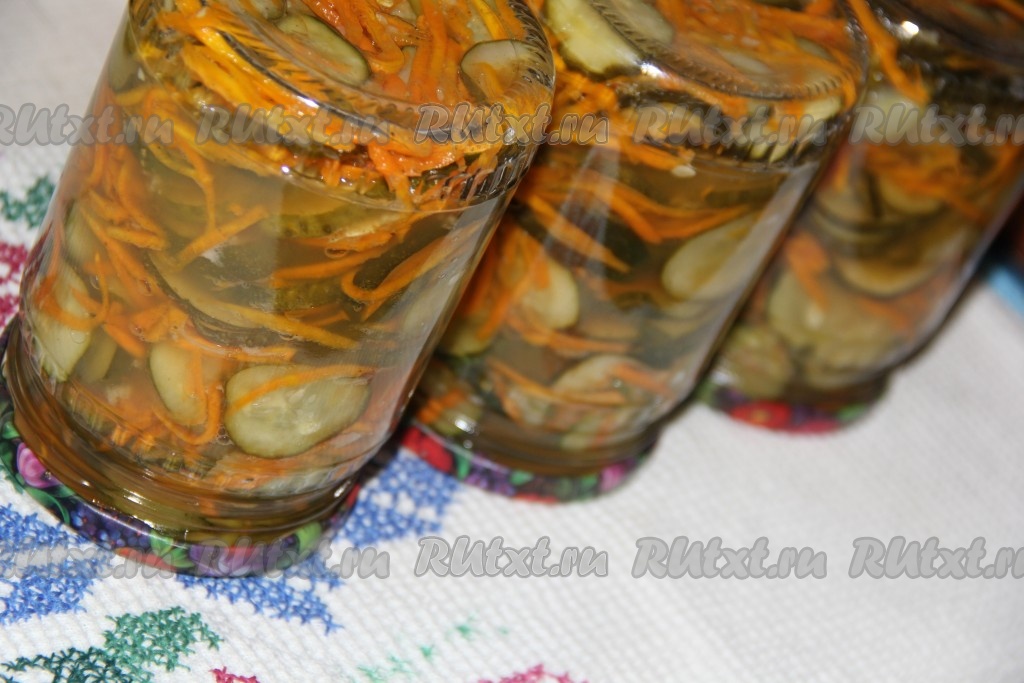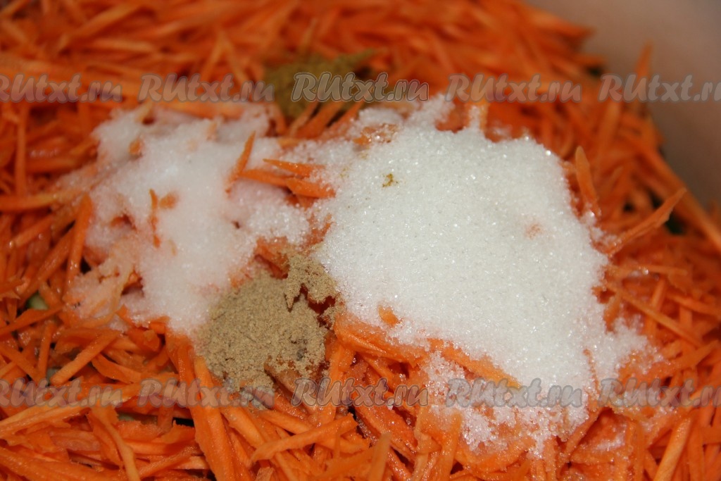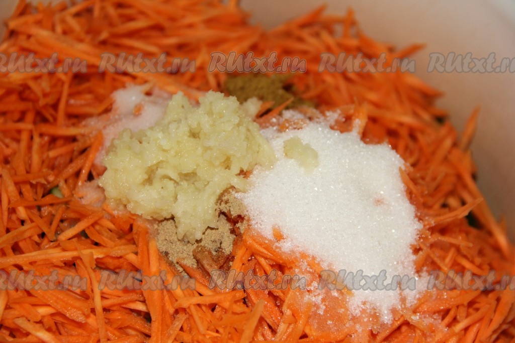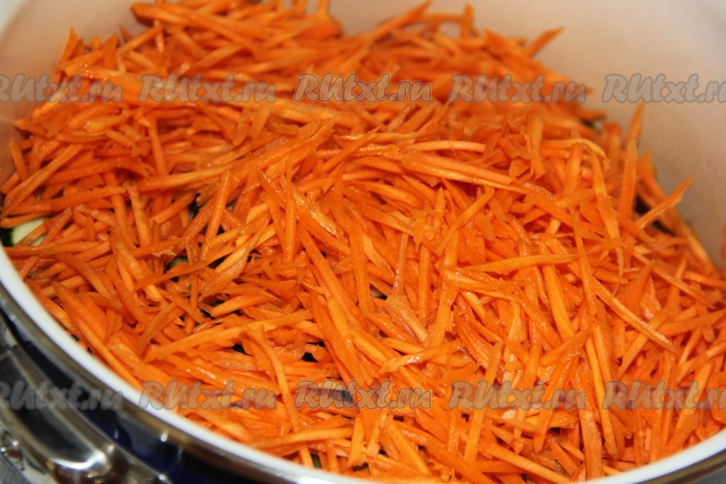 Морковь очистить, натереть на тёрке для моркови по-корейски и добавить в кастрюлю с огурцами.