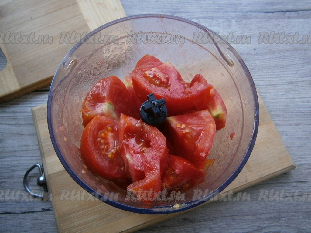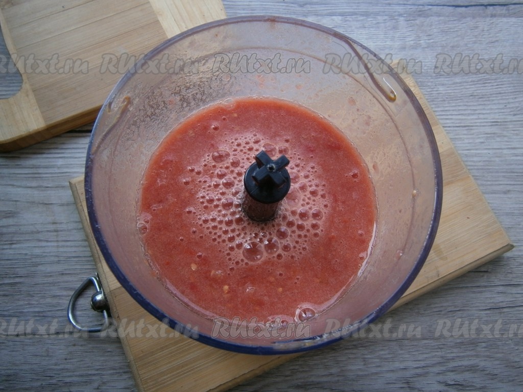 Измельчить помидоры на высокой скорости в блендере или пропустить через мясорубку.