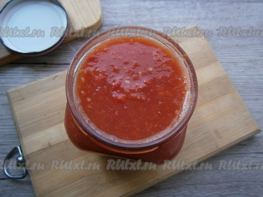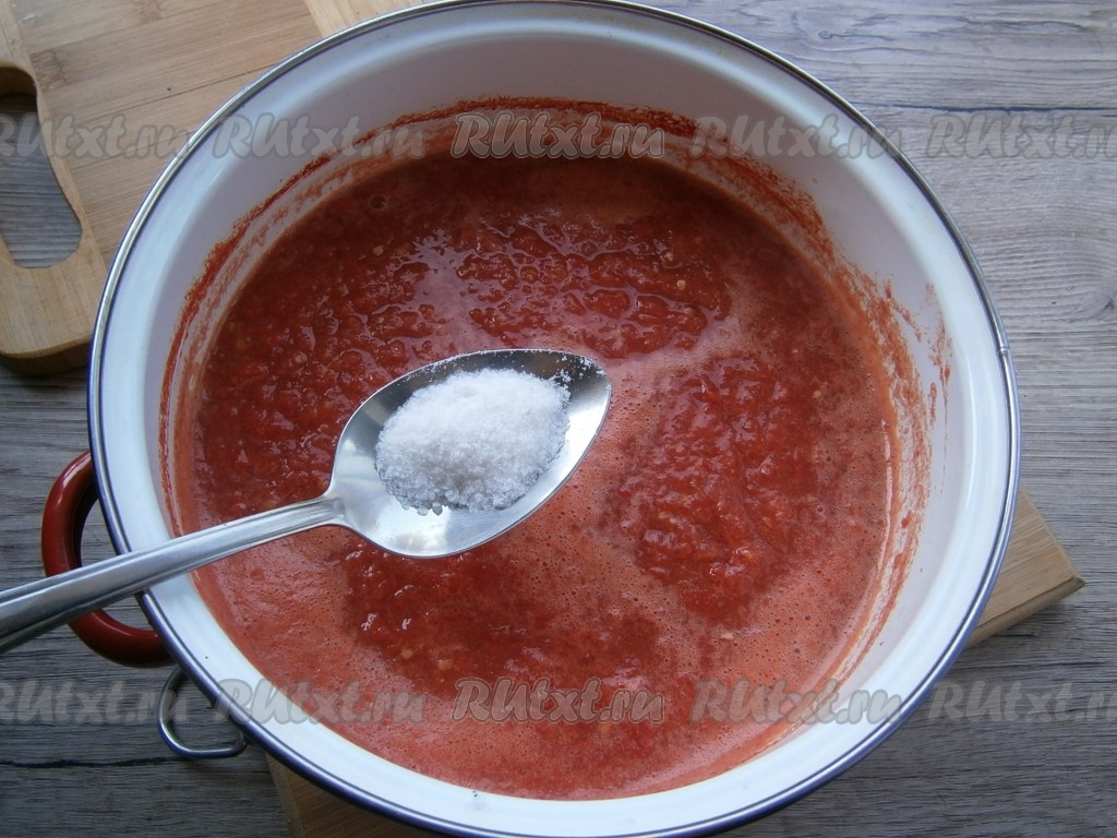 Перелить томат в кастрюлю, поставить на огонь.